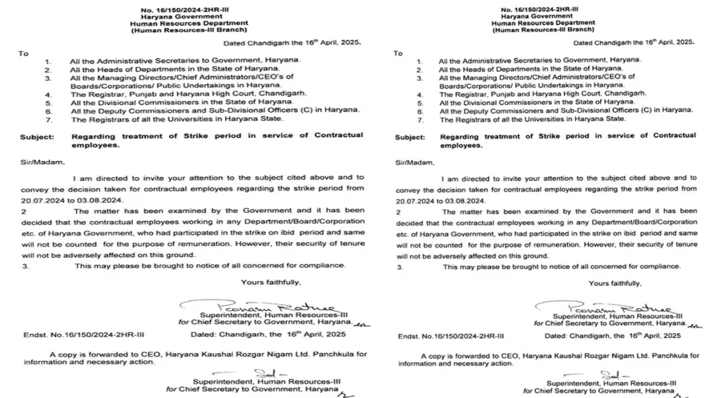 Haryana सरकार ने फैसला लिया है कि 20 जुलाई से 3 अगस्त 2024 तक हड़ताल में भाग लेने वाले किसी भी बोर्ड या निगम में कार्यरत संविदा कर्मचारियों की नौकरी की सुरक्षा बरकरार रहेगी। मानव संसाधन विभाग ने निर्देश जारी कर स्पष्ट किया है कि हड़ताल के दिनों के लिए कोई पारिश्रमिक तो नहीं दिया जाएगा, लेकिन इस आधार पर इन कर्मचारियों की कार्यकाल की सुरक्षा पर प्रतिकूल प्रभाव नहीं पड़ेगा।