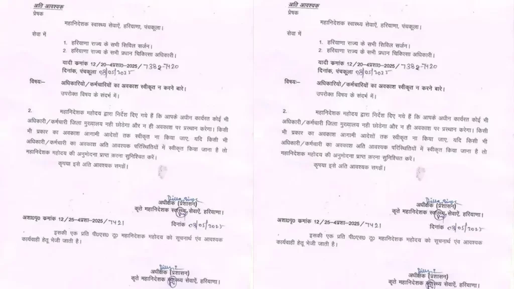 इमरजेंसी जैसी स्थिति से निपटने के लिए हरियाणा सरकार ने हेल्थ विभाग के अधिकारियों और कर्मचारियों की छुट्टियां रद्द कर दी हैं। इसको लेकर 8 मई को स्वास्थ्य सेवाओं के महानिदेशक की ओर से सभी चीफ मेडिकल ऑफिसर (CMO) को पत्र जारी कर दिया गया है। इस पत्र में लिखा- आपके अधीन आने वाले अधिकारी व कर्मचारी बिना मंजूरी के जिला मुख्यालय नहीं छोड़ सकते हैं और न ही अवकाश पर जा सकते हैं। किसी भी प्रकार का आदेश आगामी आदेशों तक मंजूर नहीं किया जाएगा। अगर किसी को इमरजेंसी में अवकाश लेना है तो महानिदेशक की मंजूरी के बिना नहीं दिया जाएगा