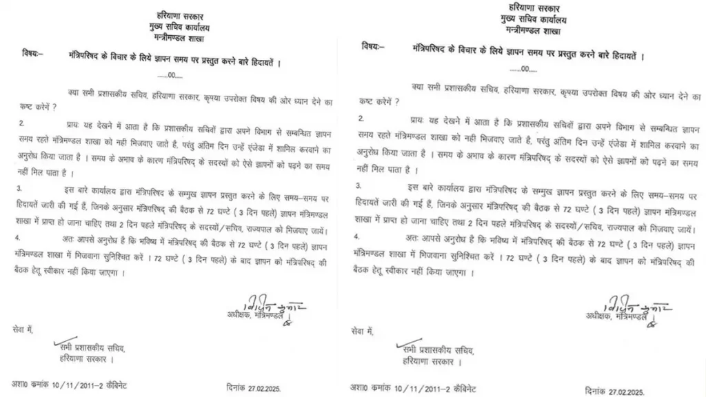 - लेटर में प्रशासनिक सचिवों को हिदायत दी गई है कि भविष्य में मंत्रिपरिषद की बैठक से 72 घंटे (3 दिन पहले) ज्ञापन मंत्रीमण्डल शाखा में भिजवाना सुनिश्चित करें। 72 घंटे (3 दिन पहले) के बाद ज्ञापन को मंत्रिपरिषद की बैठक के लिए स्वीकार नहीं किया जाएगा।