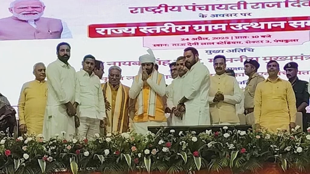 राष्ट्रीय पंचायती राज दिवस के मौके पर Haryana सरकार ने 24 अप्रैल, आज, पंचकूला के ताऊ देवी लाल स्टेडियम में राज्य स्तरीय ग्राम उत्थान सम्मेलन का आयोजन किया। इस अवसर पर, पंचकूला में हुए ग्राम उत्थान समारोह के दौरान पहलगांव में हुए हादसे में जान गंवाने वालों को श्रद्धांजलि अर्पित करने के लिए सभी ने दो मिनट का मौन रखा। इस कार्यक्रम में मुख्यमंत्री नायब सैनी, पंचायत मंत्री कृष्ण लाल पंवार, विधानसभा स्पीकर हरविंद्र कल्याण, कृषि मंत्री श्याम सिंह राणा, शिक्षा मंत्री महिपाल ढांडा, सिंचाई मंत्री श्रुति चौधरी और मंत्री रणबीर गंगवा ने शिरकत की।